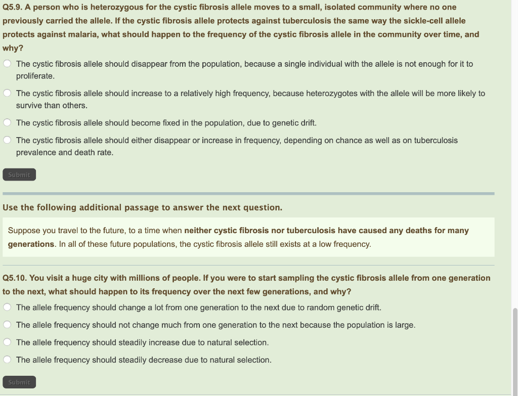 Solved 05 9 Person Who Is Heterozygous For The Cystic Fibrosis Allele Moves To Small Isolated Community Where No One Previously Carried The Allele If The Cystic Fibrosis Allele Protects Against Tuberculosis The Same